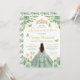 Celebrate her milestone in style with this elegant Quinceañera invitation featuring a girl in a sparkling green ball gown, viewed gracefully from the back. Surrounded by soft florals, fluttering butterflies, and a regal golden crown, the design blends youthful charm with royal sophistication. The color palette includes sage green, shimmering gold, and soft leafy greens—perfect for spring or summer celebrations. Ideal for princess-themed parties, this invitation sets a magical tone for an unforgettable evening.