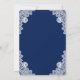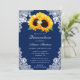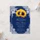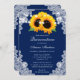 Belle invitation de fête de quinceañera florale avec un bouquet de tournesols sur fond bleu marine orné de dentelle florale blanche et de guirlandes lumineuses.