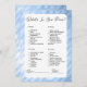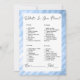 Élevez la joie de votre douche nuptiale avec le jeu engageant et interactif "What's in Your Purse". Tandis que vos invités estimés se réunissent pour célébrer la future mariée, ils se lancent dans un agréable voyage à travers leurs sacs à main, en lisant les articles d'une liste organisée. Le revers ? Chaque objet découvert se voit attribuer une valeur, allant de 5 à 20 points, ajoutant un élément excitant de compétition amicale aux festivités. Le jeu est encadré par un arrière - plan blanc orné d'une bordure en rayures bleues en détresse, ce qui crée un équilibre harmonieux entre charme vintage et style contemporain. Le titre captivant, "What's in Your Purse", prend le devant de la scène dans une jolie police de caractères noir moderne, insufflant à l'occasion une touche d'élégance et d'intrigue. Chaque élément de jeu est soigneusement présenté dans une simple police de caractères noirs, assurant clarté et facilité de participation pour les invités de tous âges. Les mots "nom" et "total", accompagnés de lignes cursives délicates, sont rendus dans une police de caractère noir, rehaussant l'attrait visuel du jeu et contribuant à une atmosphère de célébration raffinée. La fusion de l'arrière - plan blanc immaculé et de la bordure rayée bleue crée un contraste visuel captivant qui complète parfaitement l'ambiance de la douche nuptiale. Pendant que les clients fouillent avec enthousiasme leurs sacs à main et s'engagent dans de délicieuses conversations, la salle sera remplie de rires, d'histoires partagées et de connexions sincères. "What's in Your Purse" va au-delà du simple jeu : c'est une façon merveilleuse de célébrer le voyage de la future mariée et de favoriser un environnement de joie et de convivialité. Avec ce jeu enchanteur, votre douche nuptiale sera une occasion mémorable et chère qui crée des souvenirs et des liens durables parmi tous ceux qui y assistent.
