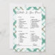 Voici le jeu captivant "What's in Your Purse", un ajout délicieux à votre douche nuptiale qui promet un rire et une connexion sans fin. Dans un décor de blanc pur, orné d'une charmante bordure verte et blanche, ce jeu dégage un charme intemporel et une sophistication moderne, ouvrant la voie à une célébration inoubliable. Les mots "What's in Your Purse" sont élégamment présentés dans une police de caractères noir moderne, invitant gracieusement vos invités à entreprendre un voyage passionnant d'exploration. Pendant que vos proches plongent dans leurs sacs, ils découvriront une variété d'objets, chacun portant une valeur allant de 5 à 20 points. Ce rebondissement inventif sur un jeu classique ajoute un élément de compétition amicale et de plaisir partagé, favorisant une atmosphère animée remplie de camaraderie et de joie. Les articles de jeu, minutieusement mis en forme dans une simple police de caractères noirs, permettent aux participants de tous âges de participer sans effort aux festivités. Le "nom" et le "total" étiquette, ornés d'une jolie police de caractère et de lignes qui l'accompagnent, apportent une touche d'élégance au design, faisant écho à l'esprit raffiné de votre douche nuptiale. Placé sur un fond blanc immaculé, orné d'une charmante bordure en plaid vert et blanc, le jeu "What's in Your Purse" devient un point focal visuel qui complète sans heurts votre décor de douche nuptiale. Au-delà de sa valeur de divertissement, ce jeu devient un catalyseur de conversations délicieuses, car les clients partagent des histoires qui font chaud au coeur et des découvertes éclatantes de rire. Élevez votre douche nuptiale avec le jeu captivant "What's in Your Purse", où l'esprit de découverte converge avec la joie de vivre ensemble. Ce jeu transforme votre célébration en une expérience immersive qui déborde de connexion, de rire et de moments précieux. Préparez-vous à une douche nuptiale qui rayonne de charme et de célébration, dans un décor de sophistication moderne et l'allure accueillante d'une bordure verte et blanche plaid contre une toile blanche immaculée.