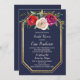 Une somptueuse invitation à la douche nuptiale fleurie avec des fleurs d'aquarelle bordeaux, rouges, prunes et crème rose + cadre doré contre un arrière - plan bleu marine. Veuillez me contacter si vous désirez de l'aide pour customiser cette invitation à la douche nuptiale.