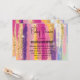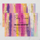 Carton d'invitation à une Baby Shower avec un design de fond abstrait. Des rayures vibrantes dans des couleurs vives et pastel. Des couleurs roses, bleues, violettes et jaunes combinées avec des paillettes dorées fausses superposées.
