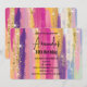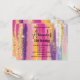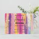 Carton d'invitation d'anniversaire avec un design de fond abstrait. Des rayures vibrantes dans des couleurs vives et pastel. Des couleurs roses, bleues, violettes et jaunes combinées avec de fausses paillettes dorées scintillantes superposées.