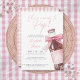 This fun baby shower invitation features a retro soda bottle with a pretty pink bow and can be personalized with your details set in stylish typography. The reverse features a pink gingham background. Designed by Thisisnotme©