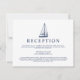 Cartes d'invitation de réception sur le thème nautique représentant un bateau à voile de style vintage et un fond rayé bleu marine et blanc au verso.