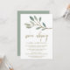 Cette carte de réception de fuite avec eucalyptus à nervures dorées est parfaite pour une fête post-fuite élégante. Le design simple et délicat présente une couche de paillettes dorées fausses sur les branches de feuilles vert olive. Les cartes de réponse sont vendues séparément.