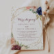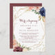 Cette carte de réception géométrique et rustique en or parties scintillant elopement est parfaite pour une soirée post elopement moderne. Le design se compose de l'aquarelle dessinée à la main violet, marine, rousse, bordeaux, fleurs marines, parties scintillant feuille verte et dorée sur un cadre géométrique élégant. Les cartes RSVP sont vendues séparément.