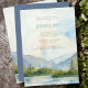 Invitation de réception de mariage en montagne avec un design aquarelle panoramique dans des tons de bleu et de vert poussiéreux. La scène au bord du lac présente des montagnes, de la verdure et des pins, le lac et un ciel clair. Tout le texte est modifiable, y compris le 'join us in the mountains' et la formulation d'introduction de la célébration de la réception de mariage. Si vous souhaitez des produits assortis, veuillez parcourir ma collection Mountain Lake.