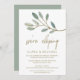 Cette carte de réception de mariage après fugue avec eucalyptus à nervures dorées est parfaite pour une fête post-fugue élégante. Le design simple et délicat présente une couche de paillettes dorées factices sur les branches de feuilles vert olive. Les cartes de RSVP sont vendues séparément.