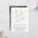 Cette belle invitation de réception de mariage moderne noir, blanc et or "Happily Ever After" comporte un faux script de calligraphie à feuilles d'or qui lit "To Love, Laughter, and Happily Ever After" comme élément principal du design. Le design est personnalisé avec votre annonce de mariage ci-dessous, et suivi des détails de votre invitation de réception de mariage ci-dessous. Le design est magnifiquement complété par la police moderne sans empattement en majuscules noires, sur le fond blanc croquant, annonçant la date et le lieu de la réception. Le dos de l'invitation comporte une oeuvre d'art aquarelle moderne noir et blanc, pour compléter le design sophistiqué.