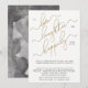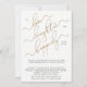 Cette belle invitation moderne de réception de mariage après la cérémonie, noire, blanche et dorée, "Happily Ever After" présente une écriture calligraphique à feuille d'or factice disant "To Love, Laughter, and Happily Ever After" comme élément de design principal. Le design est personnalisé avec votre annonce de mariage ci-dessous, et suivi des détails de votre invitation à la réception de mariage ci-dessous. Le design est magnifiquement complété par la police moderne sans serif en majuscules noires, sur le fond blanc croquant, annonçant la date et le lieu de la réception. Le dos de l'invitation présente une oeuvre d'art aquarelle moderne noire et blanche, pour compléter le design sophistiqué.