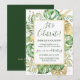 Cette élégante invitation de mariage pour une fugue tropicale présente des feuilles de palmier, de philodendron et de fougère vertes et dorées. Un cadre doré élégant met en valeur le texte vert foncé. Des éclaboussures dorées accentuent ce design botanique exotique et apportent une touche de fantaisie moderne à l'invitation. "Célébrons !" ainsi que les noms des jeunes mariés sont mis en avant en haut. Les détails des vœux de mariage et les informations sur la réception sont en dessous. Les informations de RSVP sont au dos de l'invitation.