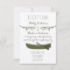Une carte de réception de mariage rustique avec une illustration de branches de sapin. Canoë vert en bas.