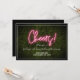 Une invitation à une réception de mariage avec le texte néon "Cheers !" sur un fond de buis avec texte et garniture blancs.