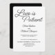 Invitation de réception de mariage chic, tendance, élégante, de couleur noir et blanc. Cette conception présente une police moderne pour les mots "L'amour est patient". Personnalisez cette annonce de mariage qui fait également office d'invitation à la réception de mariage avec les noms des mariés et tous les détails de la fête sur l'échange de vœux et la fête de mariage. Cette conception de mise en page moderne et élégante est facile à personnaliser.