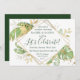 Cette invitation de réception de mariage sur le thème tropical élégant présente un feuillage exotique avec des accents dorés. Un cadre géométrique moderne doré met en valeur le texte vert foncé. Des éclaboussures d'or accentuent le design botanique et apportent une touche de fantaisie sophistiquée à l'invitation. C'est l'annonce de mariage et l'invitation à la réception parfaite pour tout mariage sur le thème tropical.