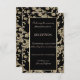 Réception de mariage avec des tourbillons élégants et chic de paillettes dorées sur fond noir.