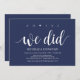 Oh oui, nous l'avons fait, carte d'invitation de réception de mariage en fuite. Cette carte d'invitation sur le thème du mariage en fuite bleu marine rustique (vous pouvez personnaliser toutes les couleurs) est parfaite pour votre réception de mariage et votre fête de célébration post-mariage. Ajoutez vos détails dans la police / lettrage correspondant.