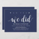 oh oui, nous l'avons fait, carte d'invitation de réception de mariage en fuite. Cette carte d'invitation sur le thème du mariage en fuite bleu marine rustique (vous pouvez personnaliser toutes les couleurs) est parfaite pour votre réception de mariage et votre fête de célébration post-mariage. Ajoutez vos détails dans la police / lettrage correspondant.
