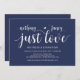 Cette carte d'invitation de mariage en fuite sur le thème rustique bleu marine (vous pouvez personnaliser toutes les couleurs) est parfaite pour votre réception de mariage et votre fête de célébration post-mariage. Ajoutez vos détails dans la police / lettrage correspondant.