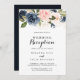 Cette invitation de réception de mariage floral élégant en hiver est parfaite pour une fête moderne après une fugue amoureuse. Le design présente de belles fleurs peintes à la main en bleu foncé, bleu, marine, rose, rose pâle, or et du feuillage vert, rassemblés en bouquets élégants.