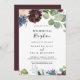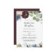 Cette invitation de réception de mariage florale et de verdure en Bourgogne est parfaite pour une fête moderne après une fugue amoureuse. Le design élégant boho présente des fleurs de couleur marine aquarelle, rose blush et nuances vin avec des détails artistiques au crayon.