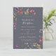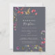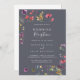 Cette invitation de réception de mariage florale sauvage bleue classique est parfaite pour une fête rustique après une fugue amoureuse. Le design présente des fleurs sauvages jaunes, violettes et blanches avec du feuillage sur un fond aquarelle rose et vert.
