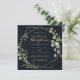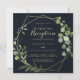 Cette invitation de réception de mariage géométrique bleu vert or est parfaite pour une simple fête après l'échange de vœux. Le design présente de belles feuilles vertes peintes à la main sur un fond bleu foncé, ornant un cadre géométrique doré.