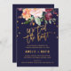 Cette carte de réception de mariage en fuite avec une floraison automnale est parfaite pour une fête post-mariage en fuite d'automne. Le design présente un magnifique bouquet de fleurs rose saumon, orange pêche et bordeaux marsala avec une typographie à feuille d'or faux et des confettis. Le dos présente un arrangement floral coordonné avec une typographie de mariage magnifique. Les cartes de RSVP sont vendues séparément.