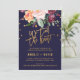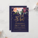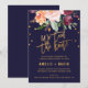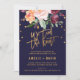 Cette carte de réception de mariage en fuite avec une floraison automnale est parfaite pour une fête après une fugue amoureuse en automne. Le design présente un magnifique bouquet de fleurs rose saumon, pêche orange et bordeaux marsala avec une typographie à feuille d'or faux et des confettis. Le dos présente un arrangement floral coordonné avec une typographie de mariage magnifique. Les cartes de RSVP sont vendues séparément.