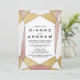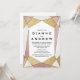 Cette carte de réception de mariage en diamant géométrique glamour est parfaite pour une fête moderne après une fugue amoureuse. Le design présente un motif géométrique hexagonal avec paillettes de faux or, feuille de faux or rose et texture de faux marbre qui ornent les espaces dans le motif. Les cartes de RSVP sont vendues séparément.