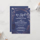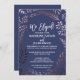 Cette carte d'invitation de réception de mariage intime élégant en rose gold et bleu marine est parfaite pour une fête d'élopement classe. Le design présente un magnifique cadre feuillu rose pâle sur fond bleu foncé et est associé à une police cursive étincelante. Les cartes de RSVP sont vendues séparément.