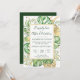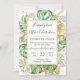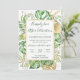 Cette élégante invitation de réception de mariage tropical comprend des feuilles de palmier, de philodendron et de fougère vertes et dorées. Un cadre doré élégant met en valeur le texte vert foncé. Des éclaboussures dorées accentuent ce design botanique exotique et apportent une touche de fantaisie moderne à l'invitation. "Célébration pour toujours heureux" ainsi que les noms de la mariée et du marié sont indiqués en haut. Les détails des vœux de mariage, le lieu et la date de la réception sont détaillés au recto. Les informations de RSVP figurent au verso de l'invitation.
