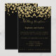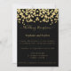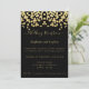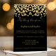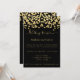 Carton d'invitation de réception de mariage avec confettis dorés sur fond noir.