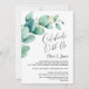 Invitez vos amis et proches à votre réception de mariage avec cette invitation aux feuilles d'eucalyptus vertes aquarelle présentant une image du couple heureux au verso pour célébrer votre mariage récent.