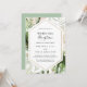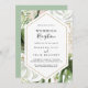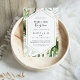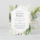 Cette invitation de réception de mariage tropical avec dorure géométrique est parfaite pour une fête moderne après une fugue amoureuse. Le design présente des éléments peints à la main à l'aquarelle dorée et des feuilles de palmier et de bananier vertes avec des fleurs roses regroupées en bouquets, ornant un cadre géométrique.
