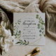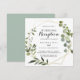 Cette invitation de réception de mariage tropical vert or géométrique est parfaite pour une simple fête après l'élopement. Le design présente de belles feuilles vertes peintes à la main, ornant un cadre géométrique doré.