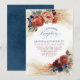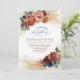 Cartes d'invitation de mariage pour réception de soirée élégante botanique avec fleurs de terre cuite, bleu marine, nuances rouille et herbe de pampas