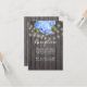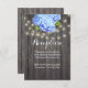 Cartes de réception en bois de grange aux hortensias bleus et guirlandes lumineuses.