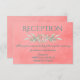 Cette belle carte de réception rose est la solution pour les couples qui organisent leur réception de mariage dans un lieu séparé de la cérémonie de mariage. Affichant une couleur de parchemin rose en toile de fond, les détails de la réception sont énumérés dans une police bleue complémentaire. Il y a un beau motif floral rose et vert juste sous le titre. Découvrez la collection pour d'autres articles liés au mariage. Personnalisez votre carte de réception dès aujourd'hui !