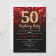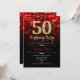 Invitation à la fête du 50e anniversaire. Design noir rouge élégant avec de l'or de parties scintillant imitation. Dispose de diamants élégants, lumières de livres et police de script. Hommes ou femmes anniversaire invitation. Idéal pour une fête d'anniversaire pour adultes. Personnalisez avec vos propres détails. Message-moi si vous avez besoin d'une personnalisation plus poussée. Invitations Zazzle imprimées ou téléchargement instantané modèle imprimable numérique.