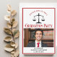 Cette invitation classique rouge et noir à la remise des diplômes de l'école de droit coutumier présente une typographie classe pour une classe de 2025 diplômée au-dessus de votre photo d'étudiant. Customisez avec votre année de graduation sous les échelles de la justice et de la photographie pour un grand avocat ou invitation d'avocat personnalisé.