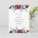 This design features a striking watercolor arrangement of bold red anemones paired with delicate blue blossoms and verdant foliage. The crisp white background emphasizes the richness of the primary color palette, creating a look that is both classic and artistic. Lush greenery and soft blue sprigs add texture and depth to the clusters. It is an ideal choice for a summer event seeking a high-contrast and nature-inspired aesthetic.
