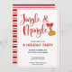 Invitation à la soirée Red Jingle & Mingle avec des cloches en jingle d'or et de jolies lettres de script. Bandes rouges et blanches sur le dos.