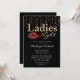 Cette invitation à l'événement personnalisé propose un thème de soirée Dames sur un arrière - plan noir solide. "Ladies Night" est imprimé dans une parties scintillant dorée glamour et une police de style feuille. Une paire de lèvres de parties scintillant rouge dans une marque de baiser est placée à côté de la "Nuit". De magnifiques lampes à cordes dorées accentuent la partie au-dessus du mot "Ladies".