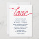 Faire-part de mariage moderne en rouge, bleu marine et blanc. L'amour est écrit dans un grand script rouge cerise au-dessus du texte de l'invitation en bleu. Le dos est recouvert de fines rayures bleu marine et blanc.
