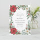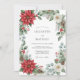 This design features a lush botanical arrangement perfect for a seasonal winter event. Vibrant red poinsettias and crisp white roses are nestled among frosted eucalyptus, pine branches, and traditional holly leaves. Small clusters of red berries and rustic pinecones add a cozy, natural touch to the watercolor greenery. The palette of deep crimson, snowy white, and sage green creates a warm and festive atmosphere.