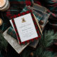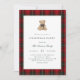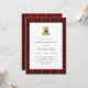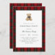 Red plaid patterned Christmas card with a cute teddy bear illustration.