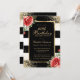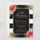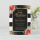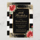 Elégante invitation à 60ème anniversaire rayée noir et blanc avec cadre doré décoré de confettis d'or, roses rouges et verdure.