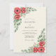 This design features vibrant red ranunculus blooms paired with lush green eucalyptus foliage. The botanical elements are arranged in delicate corners against a warm cream background, creating a romantic and timeless mood. Perfect for a sophisticated nature-themed event, the watercolor textures bring a soft, artistic feel.